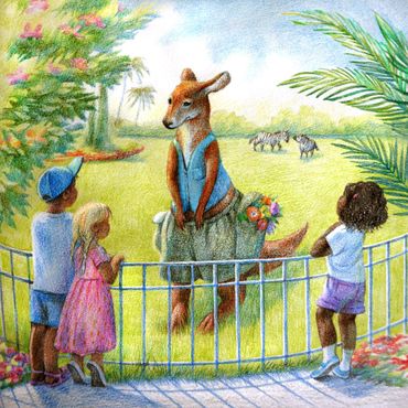 A ballerina leads young dancers in movements that complement a tale about a kangaroo who loses his jump in this picture book.