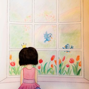Princess Petunia is bored with a capital B. Stuck inside for six days because of a relentless rainstorm, she has not been able to see her friends and seems to have exhausted every indoor activity she can think of. When her attention is drawn to her window, however, she begins to imagine herself doing things outside by moving her body. Swaying like a swing, melting like ice cream on a hot day, and pretending to blow enormous bubbles, Petunia finds a comforting sense of calm within herself.
