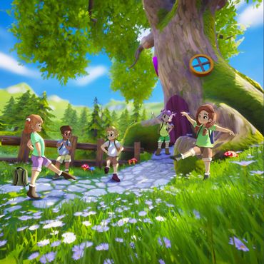 Five friends are preparing to embark on an adventure in search of Tammy the Troll, a unique little creature with spiky purple hair and a diamond in her belly button. They must gather supplies before they leave to find Tammy's home, a hollowed-out tree at the edge of the forest. As the kids pack, Konora (a real-life dancer) gets readers up and has them stretching and squatting.
